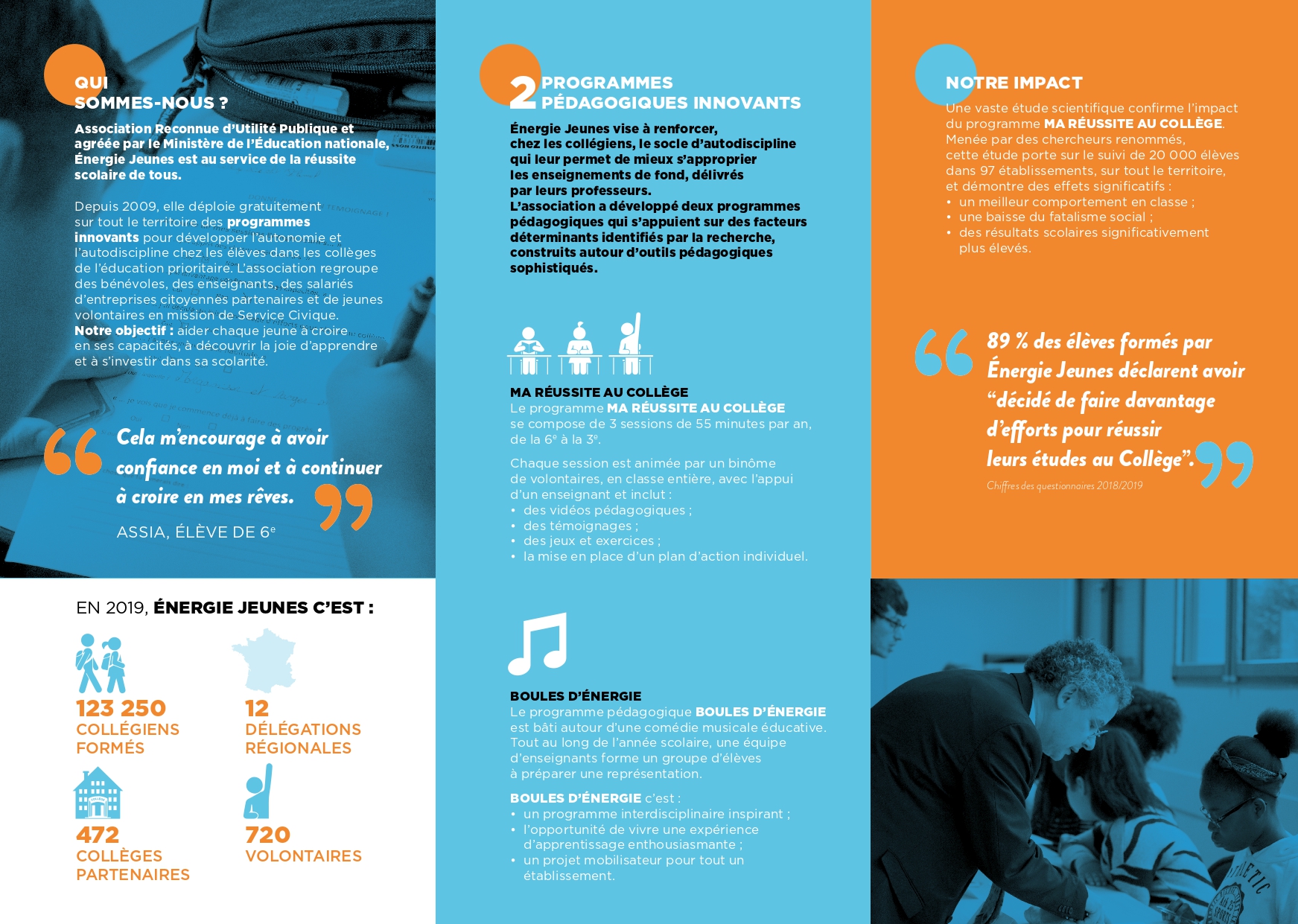 Depuis plusieurs années à présent, l'Association Energies Jeunes intervient au collège à raison de 3 sessions d'une heure pour chaque classe de la 6ème à la 4ème toute l'année. Ces ateliers animés par deux bénévoles visent à aider les jeunes à mieux s'impliquer dans leurs études au collège.